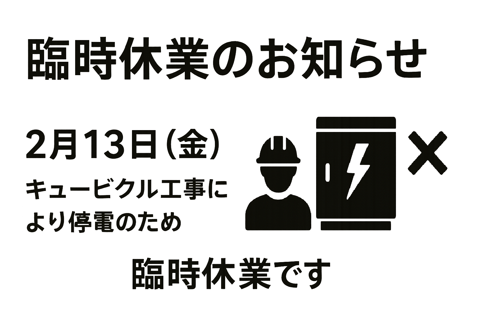 キュービクル工事に伴う全館停電のため、終日臨時休業 とさせていただきます。